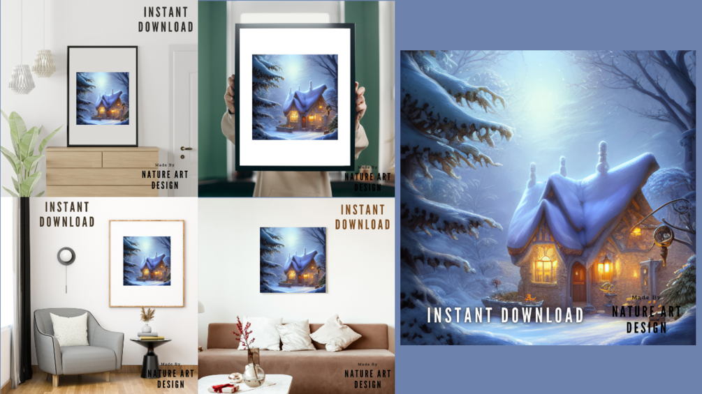 Escape to a winter wonderland with this stunning digital print of a cozy cottage nestled in the heart of a snow-covered landscape. The intricate details and serene atmosphere of this piece will transport you to a peaceful and idyllic setting.
